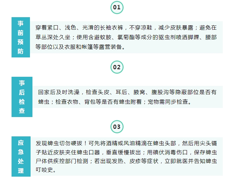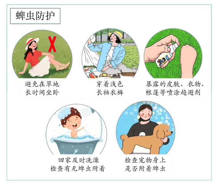 蜱蟲(chóng)叮咬多發(fā)生于春夏季(4-10月),因南方濕熱的氣候,蜱蟲(chóng)活躍期相對(duì)比北方更長(zhǎng)。市民享受美妙的草坪時(shí)光的同時(shí),建議采取以下防護(hù)措施:
